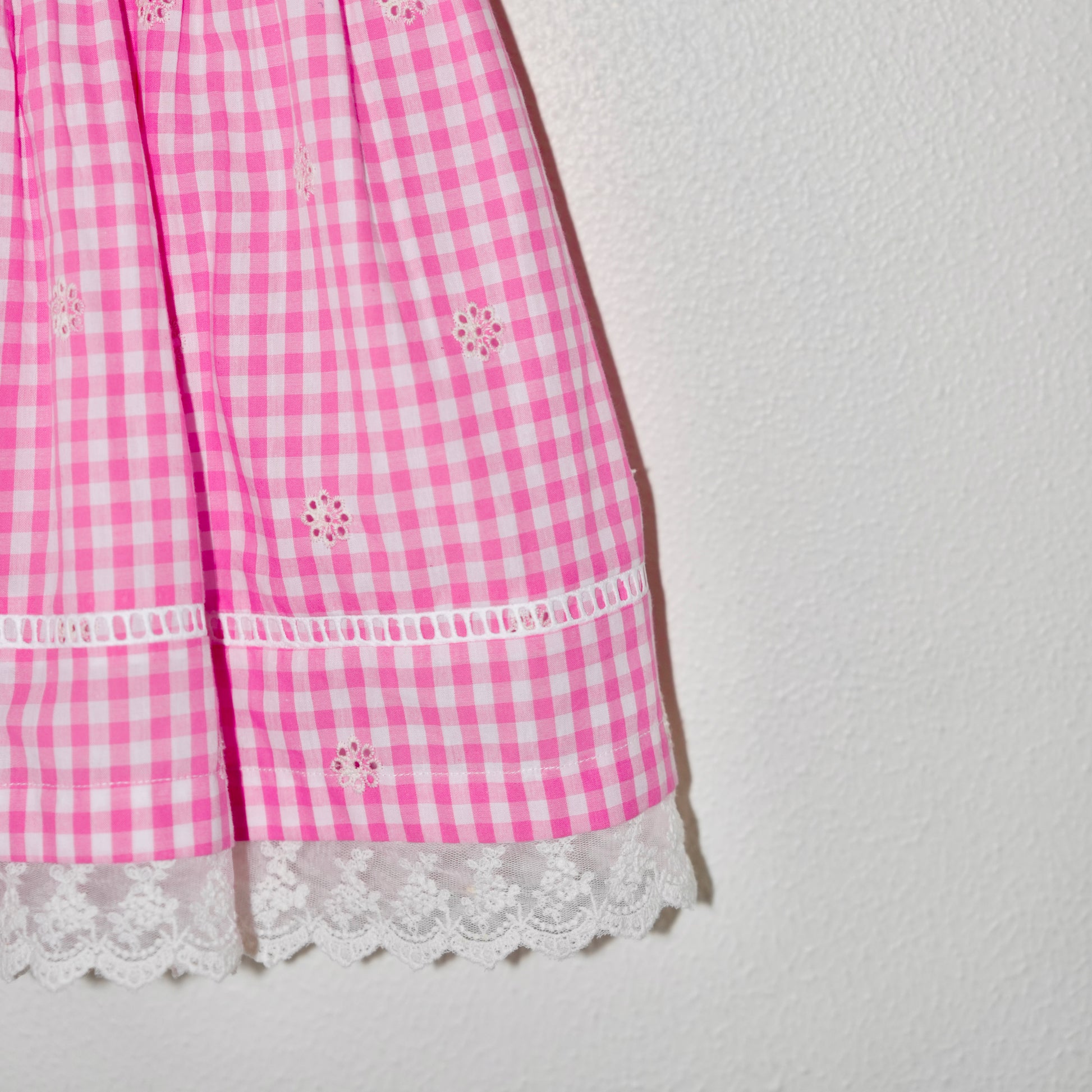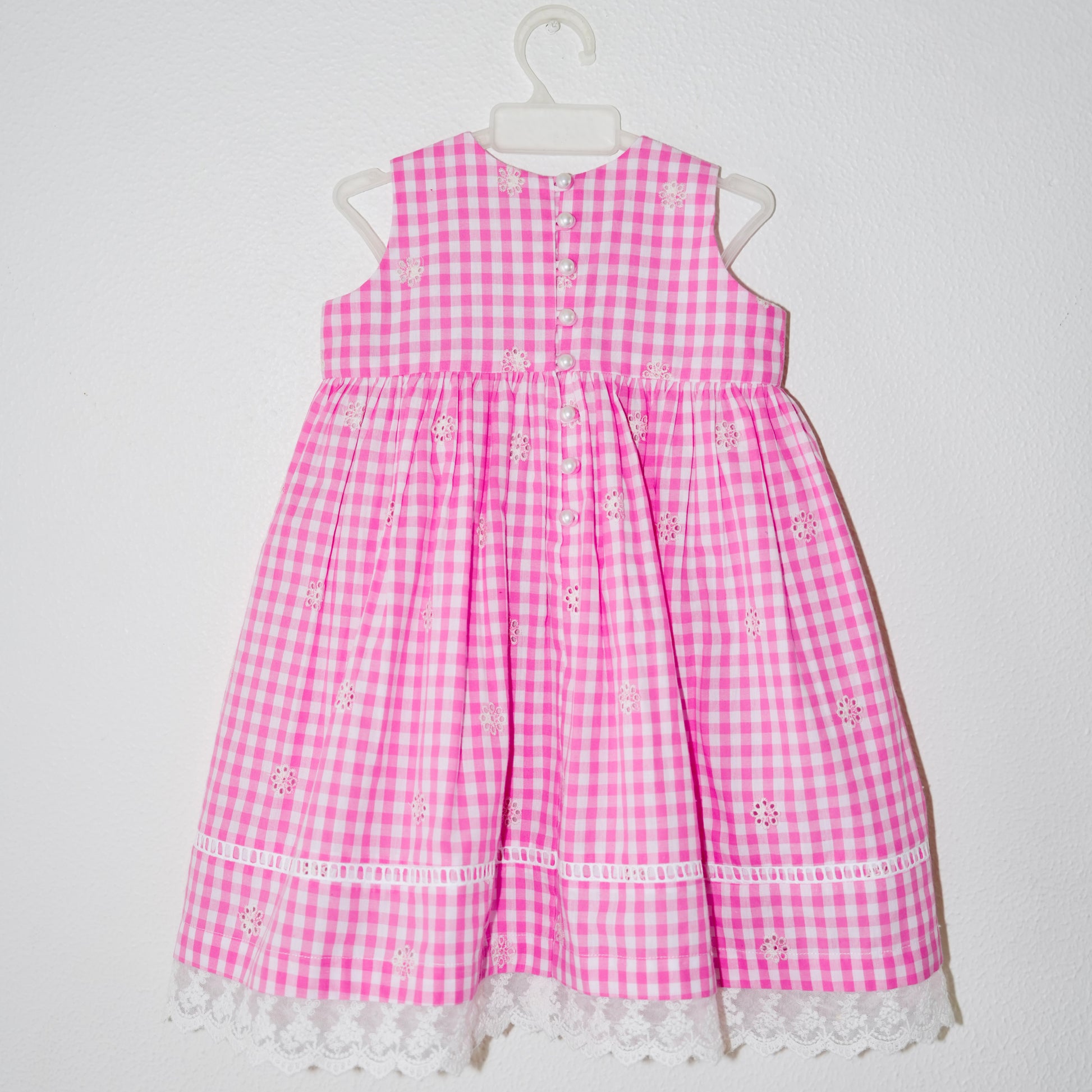 Charming gingham dress for little girls, featuring delicate lace trim and pearl detailing for a touch of vintage elegance. Perfect for special occasions or everyday twirls.