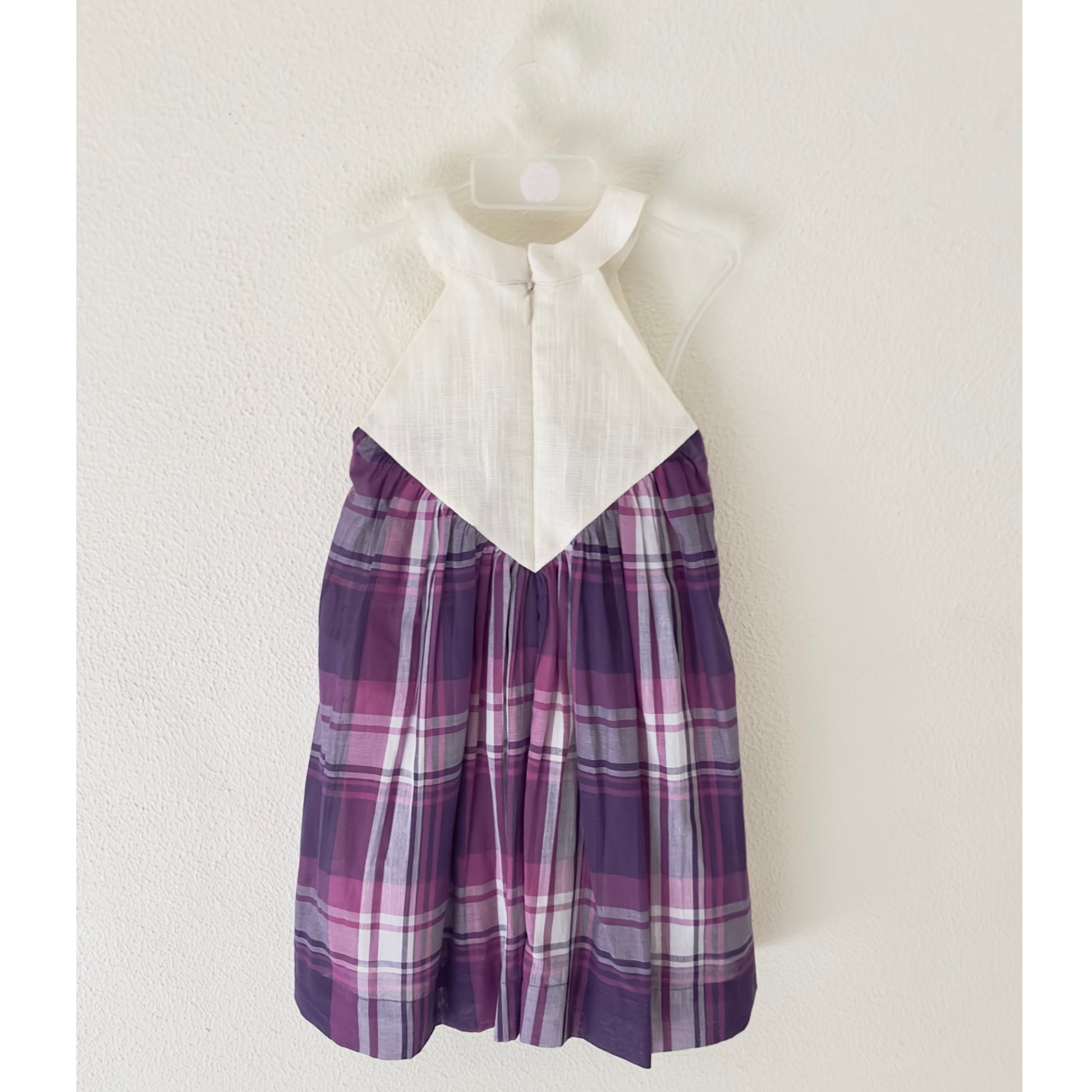 A charming girls’ dress featuring a delicately hand-embroidered bunny holding flowers on an off-white yoke, adding a touch of sweetness and craftsmanship. The dress flows into soft gathers of bright lavender and purple checks, creating a playful yet elegant contrast.