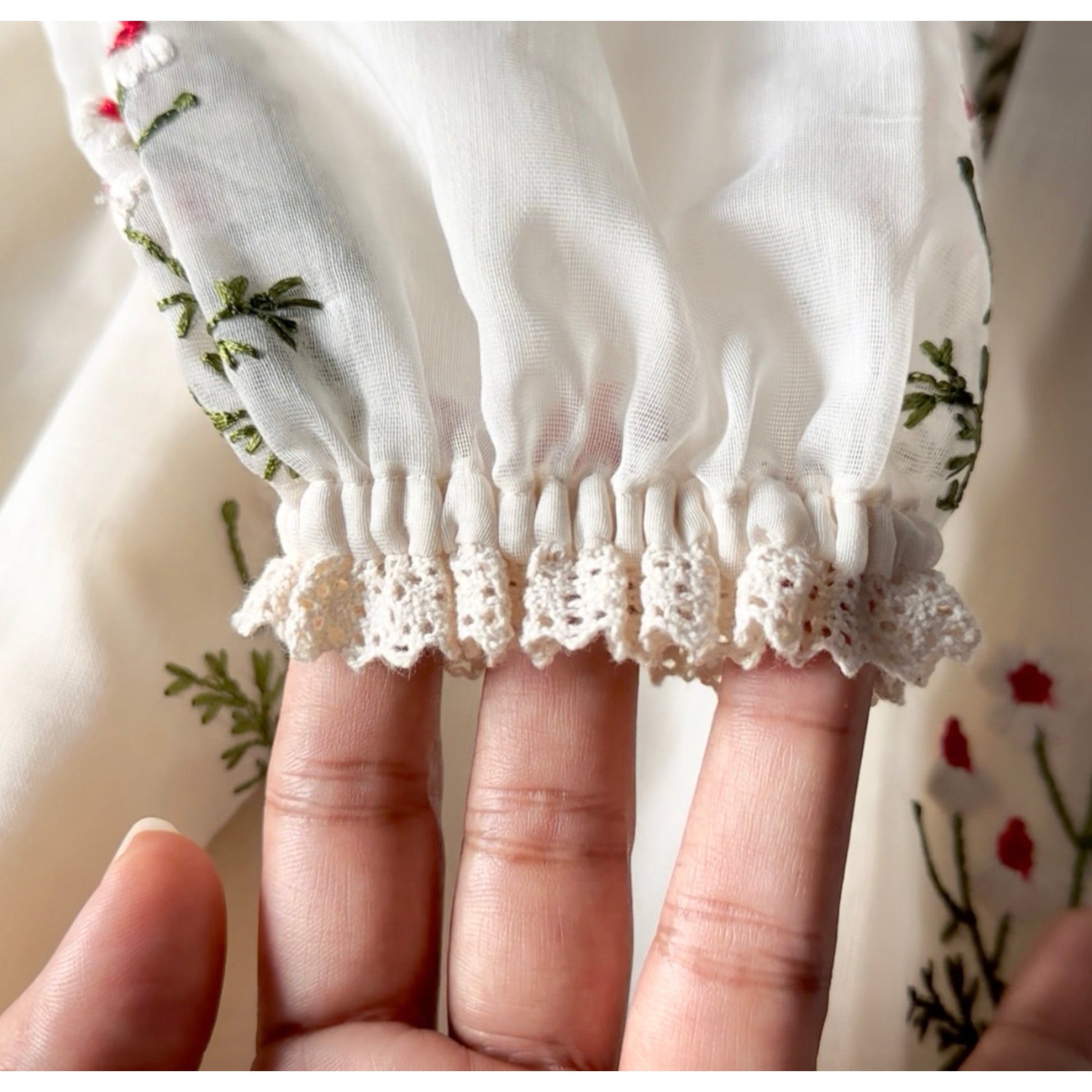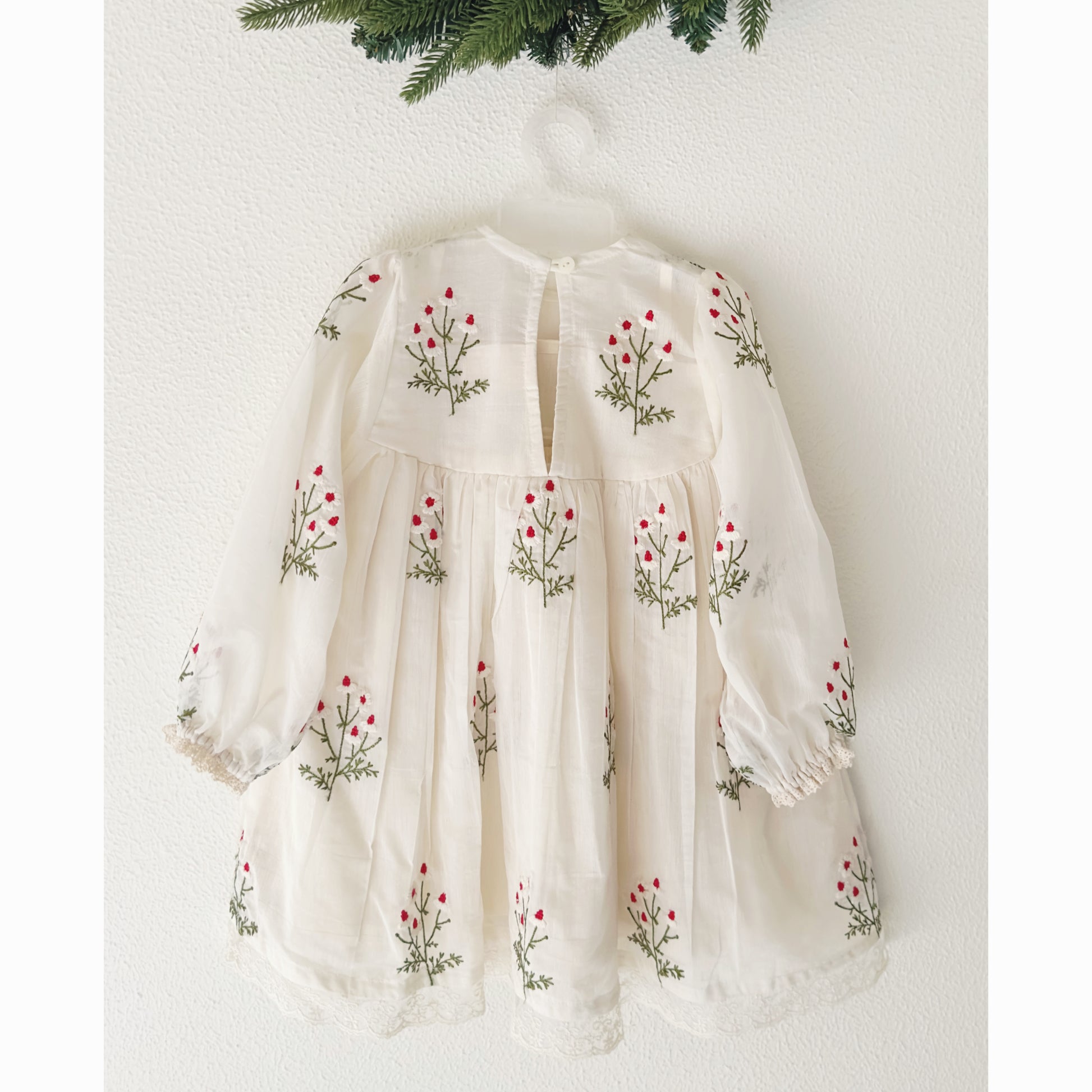 This exquisite dress for girls is crafted from luxurious Chanderi fabric, known for its lightweight texture and subtle sheen. The soft fabric is delicately adorned with intricate red and green embroidery, adding a touch of elegance to the ensemble.