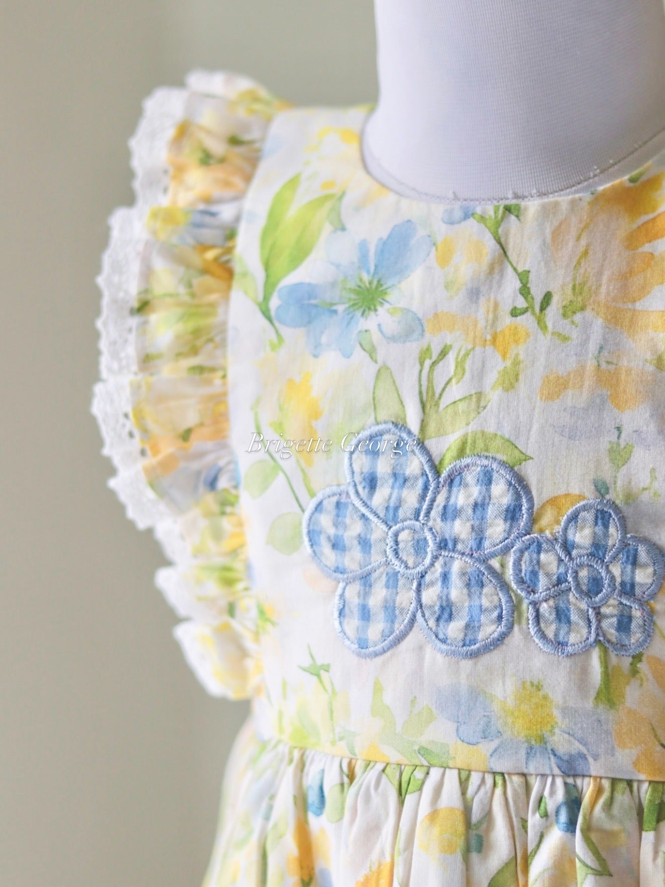 The dress features delicate appliqué work on the front yoke, adding a handcrafted touch that makes the piece truly special. A beautiful lace frill frames the neckline, bringing a hint of vintage charm to the design.