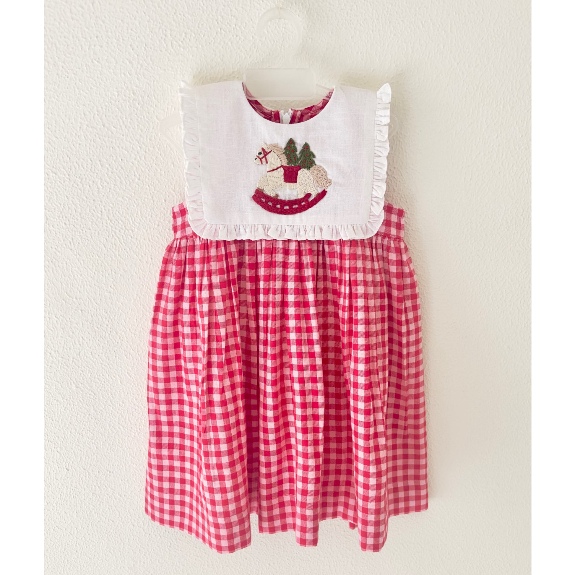 Red checks meet handcrafted elegance with a delicately embroidered horse, perfect for the Christmas season.